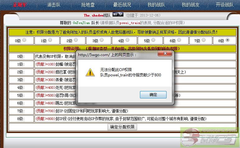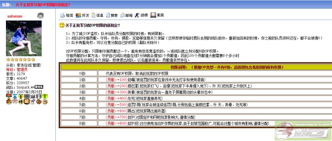 | -- 作者:GuTouJ1an -- 发布时间:2016-06-13 19:19:00 -- ★☆【The.shadow】影子战队-OP权限说明。 现在Saloman后台设置了 OP权限要根据你在战队的守服贡献值来分配OP。 队长和副队无法随意分配OP权限给队员。 限制的规定如下: 守服贡献100 1级OP 守服贡献200 2级OP 守服贡献300 3级OP 守服贡献400 4级OP 守服贡献500 5级OP 守服贡献600 6级OP 守服贡献700 7级OP 守服贡献800 8级OP 所以只有多守服,才有OP权限。 链接: 现在连副队他自己都不能分配自己OP权限。 你们要骂的话, 就找沙拉曼吧,骂他生孩子没小鸡鸡。 以后看到服务器有挂逼的话, 尽管来PM我,我随时候命。 [此贴子已经被作者于2016-06-26 7:18:06编辑过]