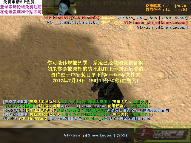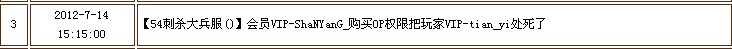 | 24 | 2012-7-14 15:15:00 | 【54刺杀大兵服()】会员VIP-ShaNYanG_购买OP权限把玩家VIP-tian_yi处死了 |