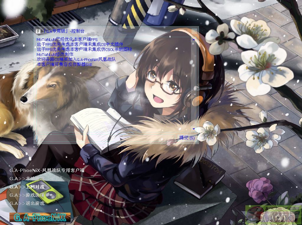 | -- 作者:MoTiaNLuN -- 发布时间:2013-04-26 18:47:00 -- [已更新]【完全兼容SXE】G.A-PhoeNiX【凤凰】专用客户端v3248 先声明下:均属本人原创,无任何复制或盗用他人成果(也没有盗用迪迪的成果),也没问其他人技术问题,都是我自己没事专研的- - [已更新]完全兼容SXE反作弊器,更新CS主题和media,删减部分内容 开启SXE后截图[NO SXE已消失] 电脑不是很好,却又想边玩边听音乐的可以用我这个版本(不需要额外打开音乐播放软件的)专题连接地址:http://bbs.sorpack.com:81/dispbbs.asp?BoardID=52&replyID=631165&id=1148559&skin=0 不喜勿喷-谢谢各位支持 2L附上本人的杀毒日志(建议下载后杀毒在使用) 2L附上本人的杀毒日志(建议下载后杀毒在使用)2L附上CS1.6各种主题包风格下载(超过20种风格可选,不影响SXE使用) 注:此版已经包含索沛服务器全部资源(除了死跑部分地图和HNS等) 预览图: G.A-CS主界面: G.A-CS退出界面