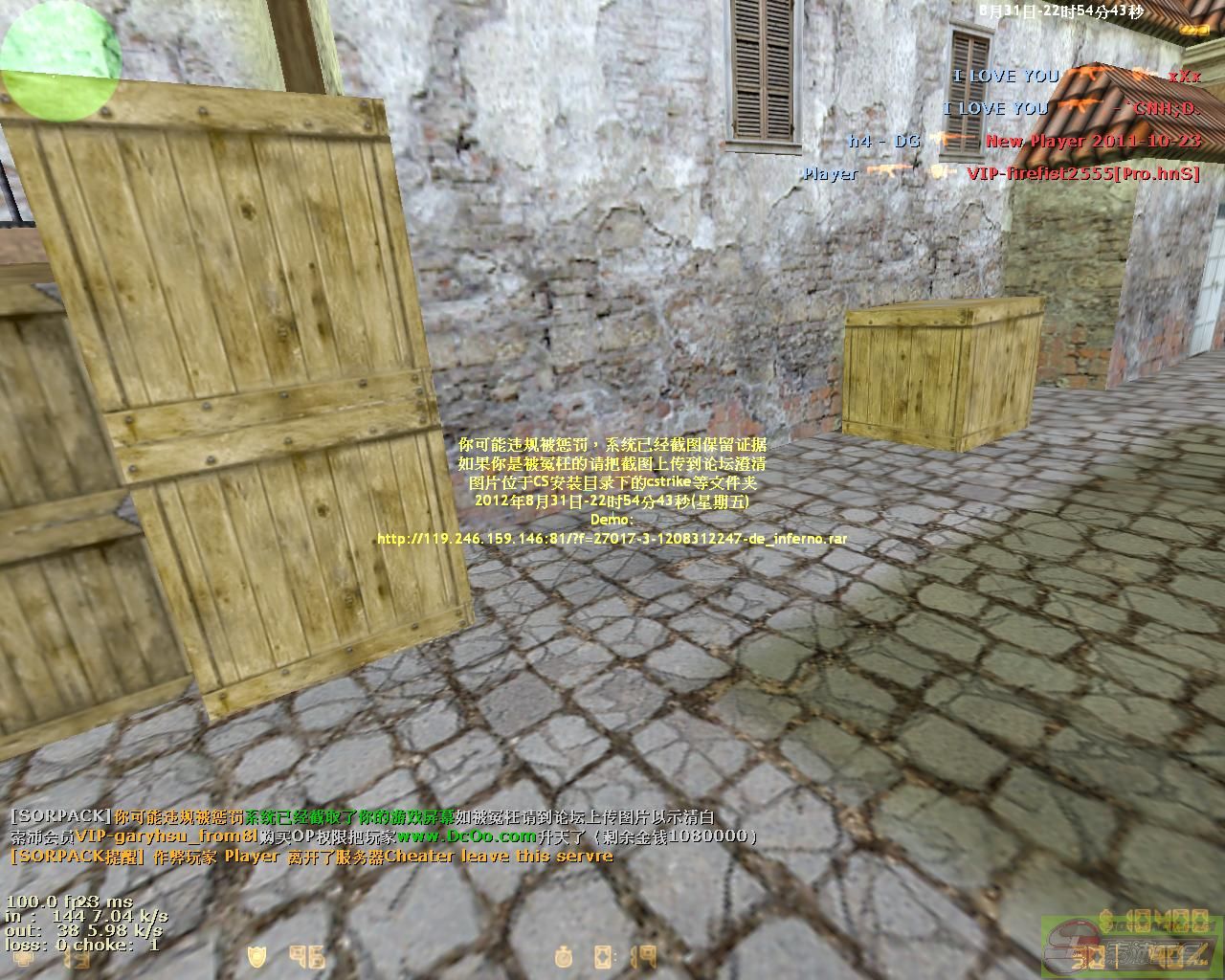 录制者:VIP-garyhsu_from8l 嫌疑人:www.DcOo.com 时间:2012年08月31日 22:52:13 服务器:[sorpack.com]-03死亡死斗服(IcE.DraGon) 地图:de_inferno 22:52:14 zx7946850 ak47--> www.DcOo.com 22:52:35 www.DcOo.com m4a1--> New Player 2011-10-23(爆头) 22:52:44 www.DcOo.com m4a1--> xXx(爆头) 22:52:52 www.DcOo.com m4a1--> xXx 22:53:24 www.DcOo.com m4a1--> dushufang12345(爆头) 22:53:33 zx7946850 ak47--> www.DcOo.com 22:53:44 www.DcOo.com m4a1--> -`CNH;D.(爆头) 22:53:47 New Player 2011-10-23 awp--> www.DcOo.com 22:53:58 www.DcOo.com m4a1--> dushufang12345(爆头) 22:54:10 www.DcOo.com m4a1--> zx7946850(爆头) 22:54:28 www.DcOo.com m4a1--> -`CNH;D.