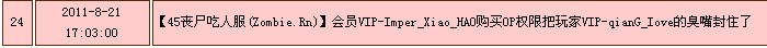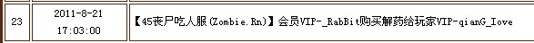 | 31 | 2011-8-21 17:03:00 | 【45丧尸吃人服(Zombie.Rn)】会员VIP-_RabBit购买解药给玩家VIP-qianG_Iove |