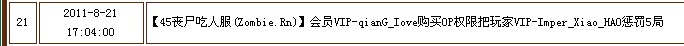 | 29 | 2011-8-21 17:04:00 | 【45丧尸吃人服(Zombie.Rn)】会员VIP-qianG_Iove购买OP权限把玩家VIP-Imper_Xiao_HAO惩罚5局 |